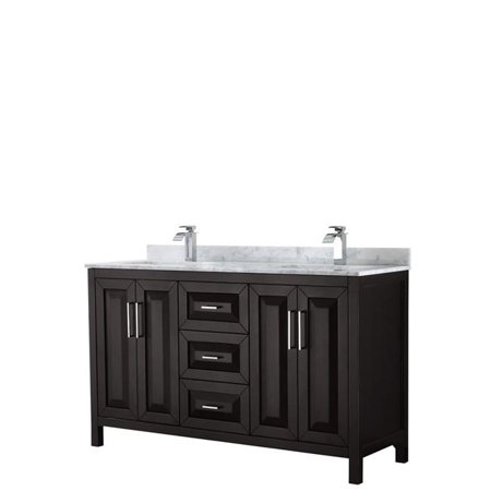 It has white marble countertop and bowl vessel single sink vanity.
